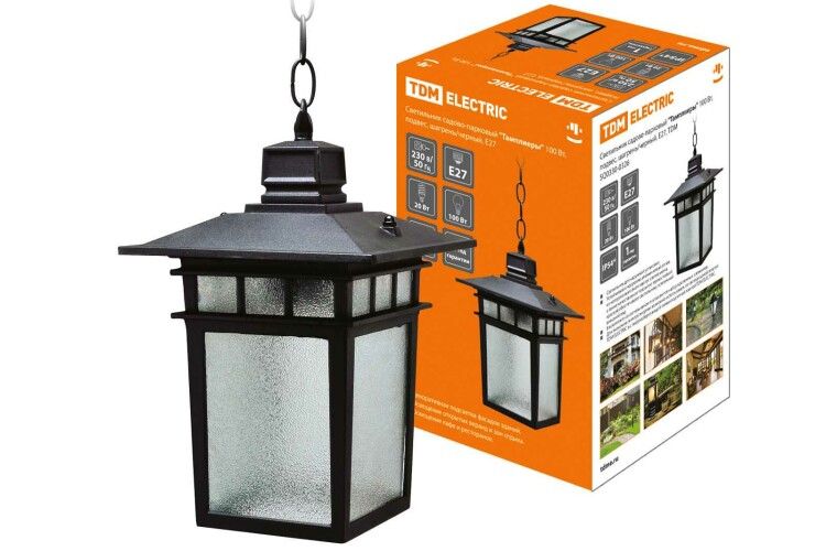 Светильник садово-парковый НСУ Тамплиеры 100Вт ЛН/КЛЛ/LED Е27 IP54 подвес, шагрень/черный SQ0330-0326 TDM ELECTRIC идеально подходит для создания декоративного освещения в садах и парках. Он поставляется в удобной картонной коробке.