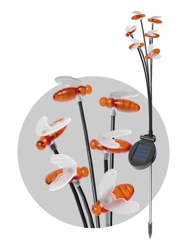 Светильник садовый 6 пчелок 6 LED пластик предназначен для декоративного и функционального освещения открытых территорий: садов, парков, дворов, террас. Шесть светодиодов имитируют форму пчелок, создавая мягкий, рассеянный свет. Подходит для мест, где невозможно или нецелесообразно прокладывать электропроводку. Идеально работает в качестве ночного подсвечивания тропинок, уличной мебели или цветочных клумб.
