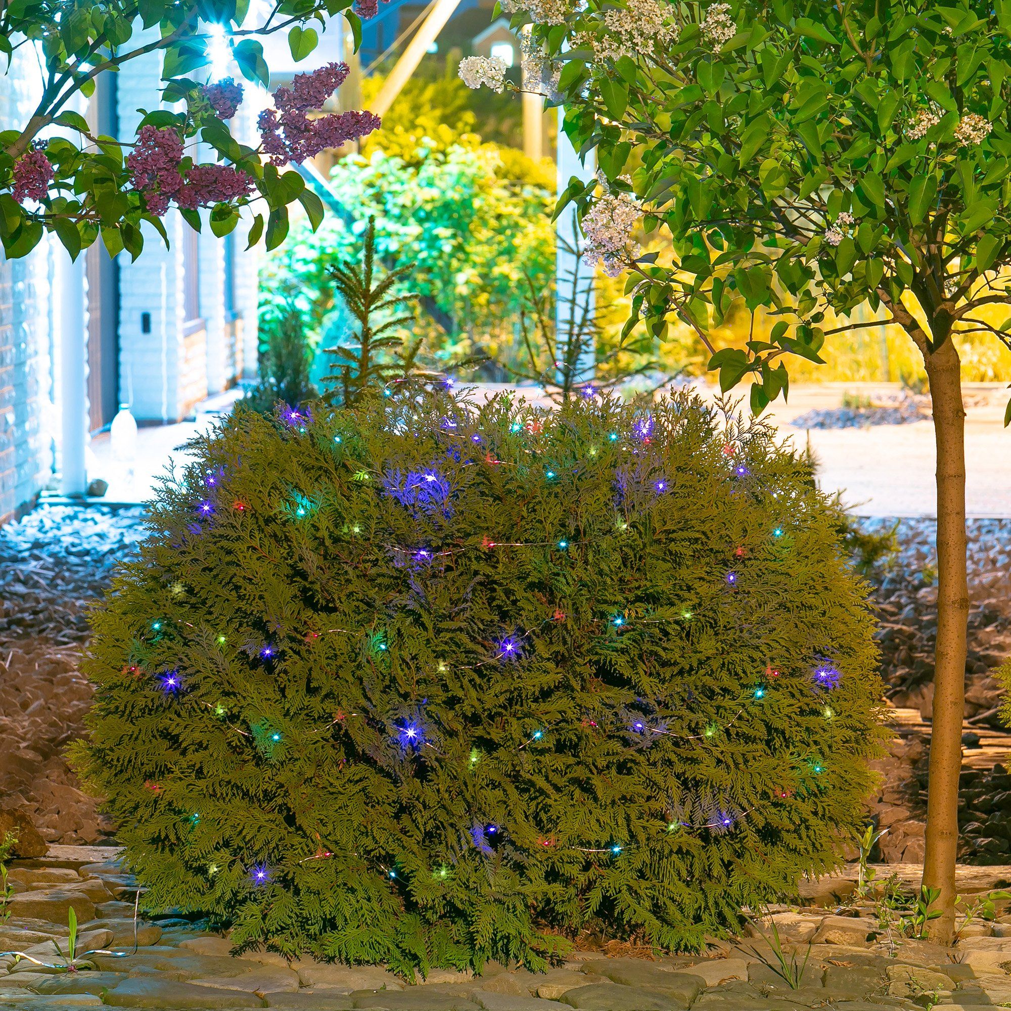 - Украшение живой изгороди - гирлянда крепится вдоль кустов на небольшом расстоянии.