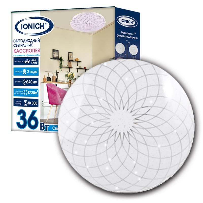 Светильник светодиодный декоративный 36Вт 2500лм 230В 6500К 350мм IP20 с эффектом "Звездное небо" от бренда IONICH - это источник мягкого холодного света, имитирующий мерцание звёзд на потолке. Подходит для интерьеров жилых помещений, ресторанов и спа-зон, где важна атмосфера уюта и визуальной глубины.