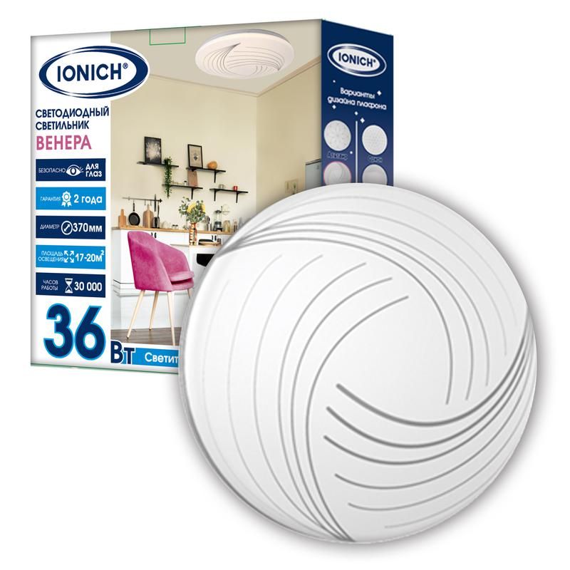 Светильник светодиодный декоративный 36Вт 2500лм 230В 6500К 350мм IP20 от бренда IONICH (артикул 1751) предназначен для создания яркого холодного света в помещениях с невысокими требованиями к защите от воды и пыли - например, в офисах, торговых залах или холлах.