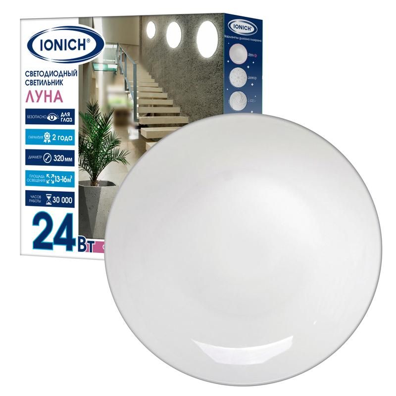 Светильник светодиодный декоративный 24Вт 1680лм 230В 6500К d320х60мм IP20 от бренда IONICH - компактный источник света для внутреннего освещения в помещениях с невысокими требованиями к защите от воды и пыли. Подходит для установки в жилых, офисных и коммерческих зонах, где важна яркая холодная подсветка.