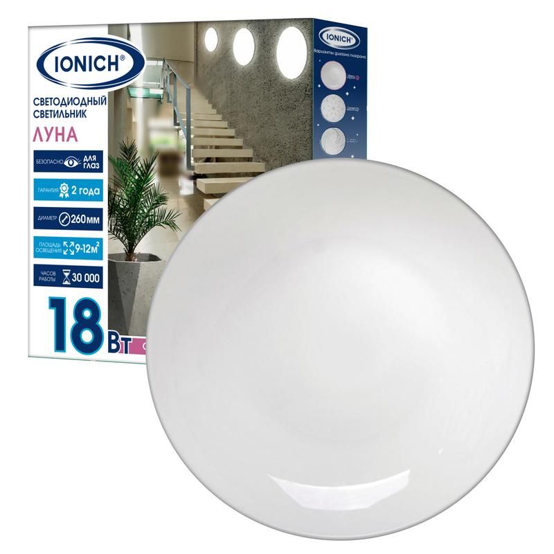Светильник светодиодный декоративный 18Вт 1260лм 230В 6500К d260х55мм IP20 от бренда IONICH (артикул 1755) предназначен для создания яркого холодного света в помещениях с невысокими требованиями к защите от пыли и влаги - например, в офисах, торговых залах или жилых комнатах.