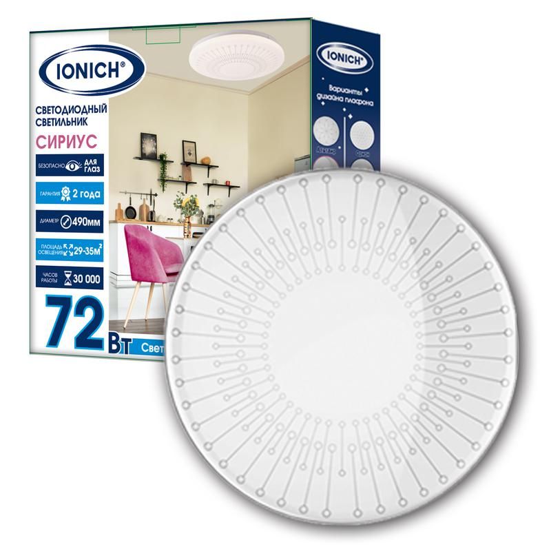 Светильник светодиодный декоративный 2160 72Вт 5000лм 230В 6500К 450мм IP20 от бренда IONICH - это компактный источник света с высокой яркостью, предназначенный для внутреннего освещения помещений с невысокими требованиями к защите от воды и пыли. Подходит для установки в офисах, торговых залах, на потолках жилых интерьеров.