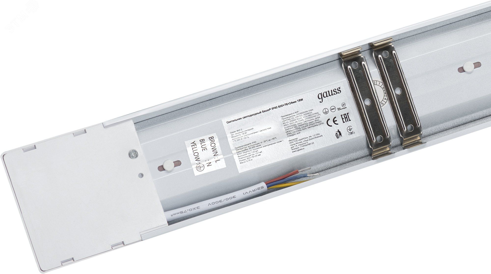 Светильник GAUSS WLF-2 имеет накладную систему крепления - монтируется прямо на стену или потолок. Для установки требуется предварительно подготовленное место с доступом к сети переменного тока 220 В. Подключение осуществляется через клеммы внутри корпуса - провода подключаются к L (фаза) и N (нейтраль). Заземление обязательно! Корпус выполнен из стали с порошковым покрытием, что делает его прочным, но требует соблюдения правил заземления. Размеры: 592×75×25 мм - легко впишется в стандартные ниши и потолочные системы.