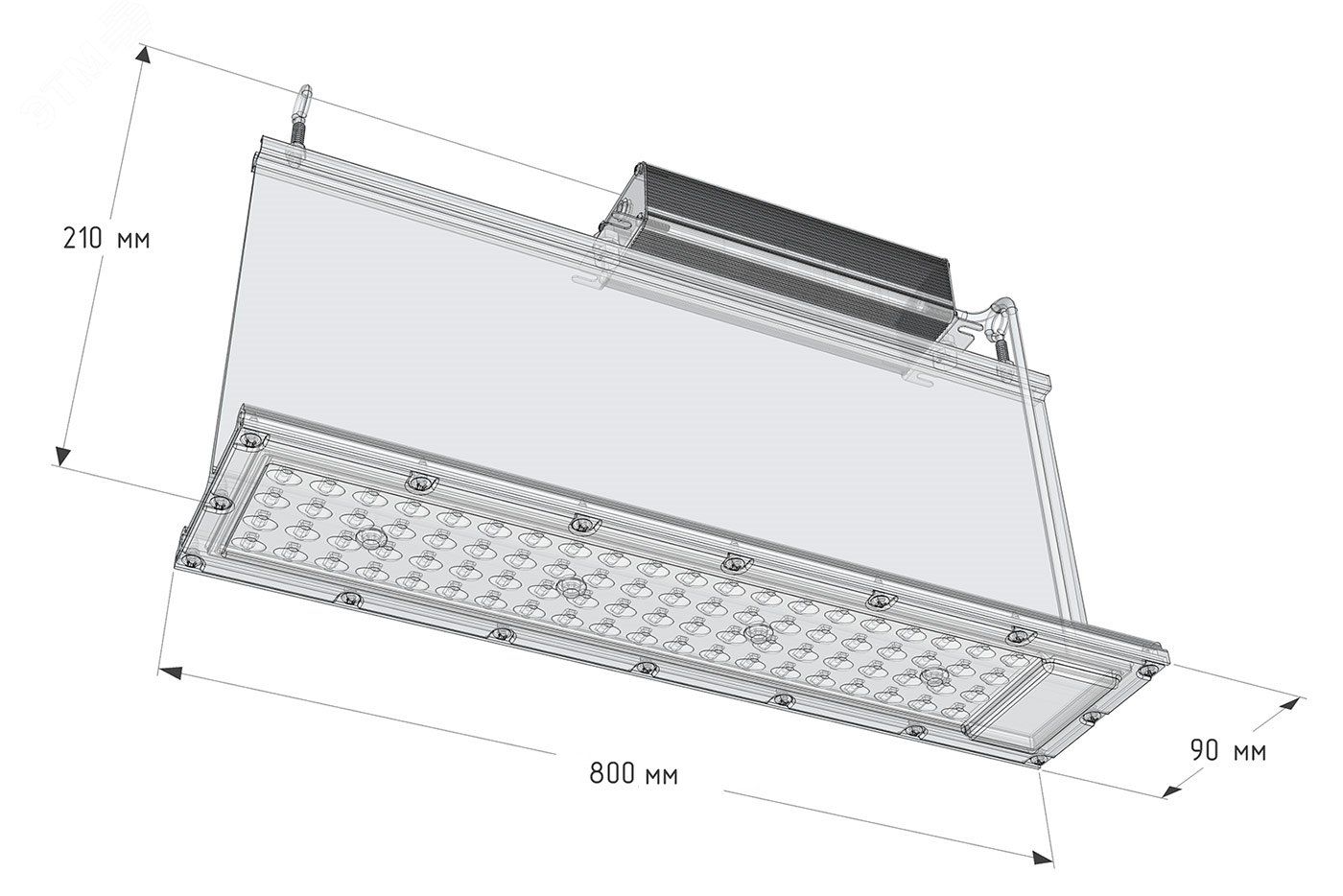 Подвесной пром свет-к с выносным ИТ+ 2шт крюка для подвеса. Защита от КЗ, перенапряжения, перегрева, ХХ, грозы, диоды CREE. Световой пучок (градусы) - 160x60.