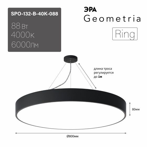Светильник светодиодный Geometria Ring SPO-132-B-40K-088 88Вт 4000К IP40 800х800х80мм подвесной драйвер внутри черн. Эра Б0058901