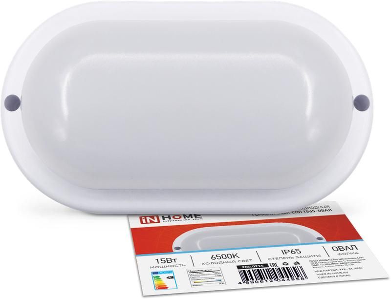 Светильник светодиодный герметичный СПП 1565-ОВАЛ 15 ватт 6500 Кельвин 1350 люмен IP65 160х88 миллиметров от бренда IN HOME - компактный, надёжный источник света для помещений с высокой влажностью, пылью или наружной установкой под навесом. Он заменяет старые лампы накаливания, потребляя на 90 % меньше электроэнергии.