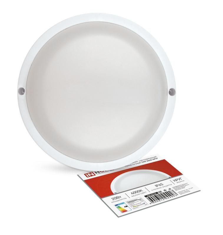 Светильник светодиодный герметичный СПП 2040-КРУГ 20 ватт 4000 кельвин 1800 люмен IP65 155 миллиметров от IN HOME - компактный, надёжный источник света для помещений с высокой влажностью, пылью или наружной установкой под навесом. Его прочный пластиковый корпус, низкое энергопотребление и равномерное рассеивание света делают его удобным решением для промышленных, коммерческих и бытовых объектов.