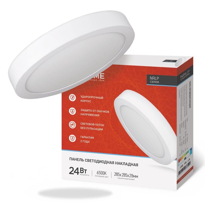 Светильник светодиодный круглый накладной NRLP 24 ватт 230 вольт 6500К 1680 люмен 285 мм белая панель IP40 от IN HOME - это компактный, энергоэффективный источник равномерного холодного белого света для внутреннего освещения помещений. Подходит для установки на стену или подвесного монтажа, не требует внешних драйверов и легко заменяет традиционные потолочные светильники.