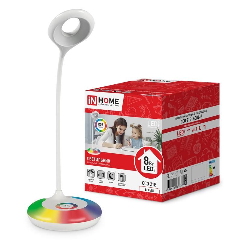 Светильник светодиодный настольный ССО 21Б 8Вт 6500К 640лм RGB-подсветка сенсор-диммер с адаптером бел. IN HOME 4690612037615