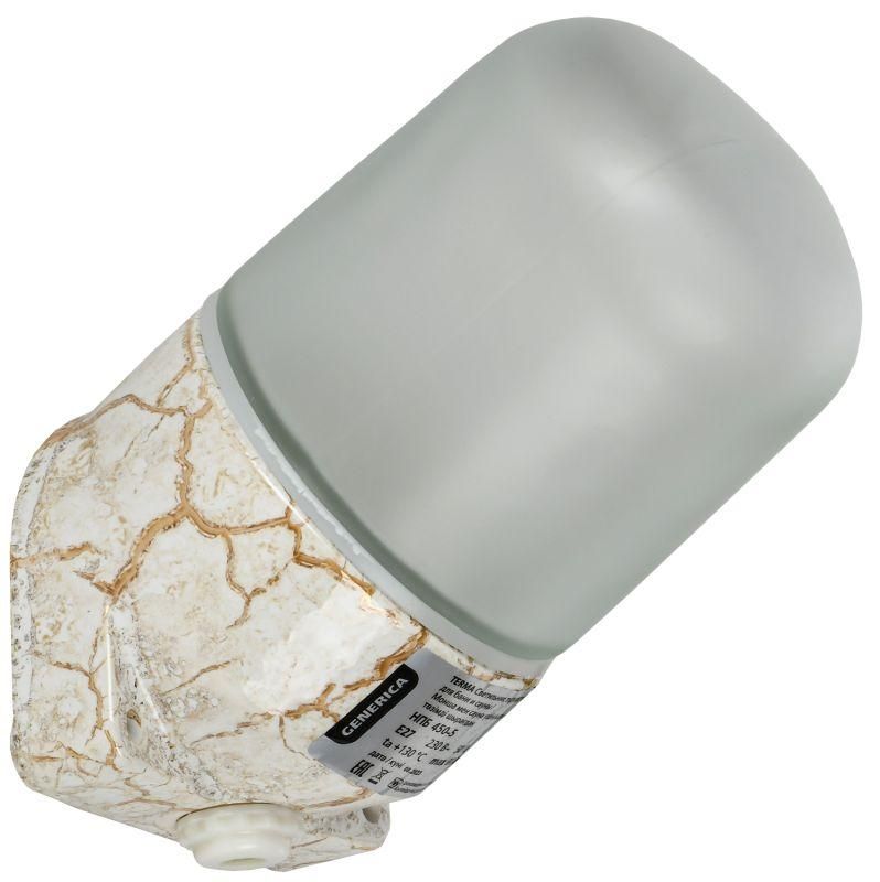 Светильник светодиодный термостойкий НПБ 450-5 IP54 60Вт мрамор наклон от GENERICA - решение для освещения помещений с экстремальными условиями: высокой температурой, влажностью и пылью. Модель из серии TERMA предназначена для установки в банях, саунах и аналогичных объектах, где важны надёжность и долговечность. Артикул ta-npb0-4505-060-k55-g сочетает керамический корпус, стеклянный плафон и степень защиты IP54.