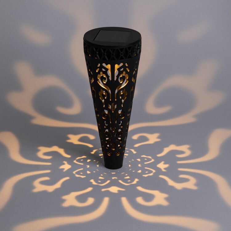 Высота светильника составляет 29 см, и он быстро и легко втыкается в грунт благодаря заостренному колышку, который поставляется в комплекте. Встроенная солнечная батарея аккумулирует солнечную энергию в течение всего дня, даже в пасмурную погоду. С наступлением сумерек светильник автоматически включается и начинает радовать вас красивым теплым светом с ажурным световым рисунком.