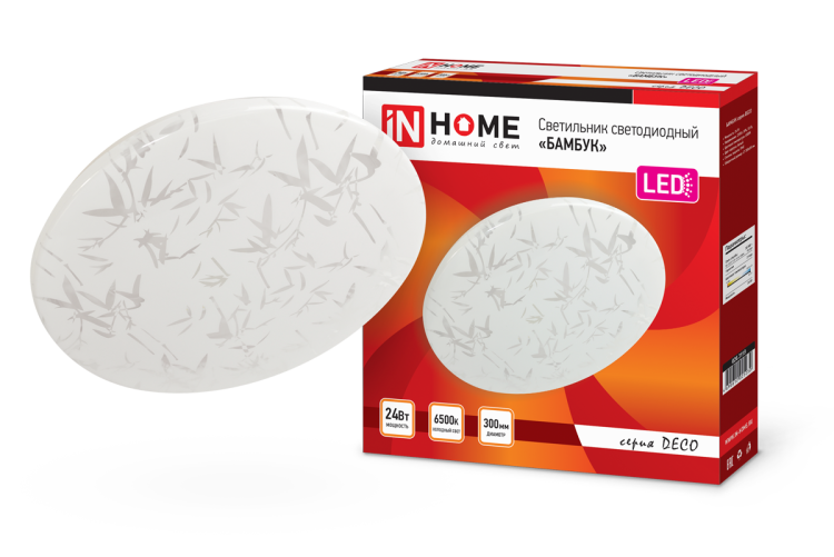 Светодиодный светильник БАМБУК от IN HOME - компактный и элегантный источник света с декоративным принтом листьев бамбука, подходящий для интерьерного освещения в жилых и общественных помещениях. Артикул 4690612025230 обеспечивает равномерный холодный белый свет при минимальном энергопотреблении.