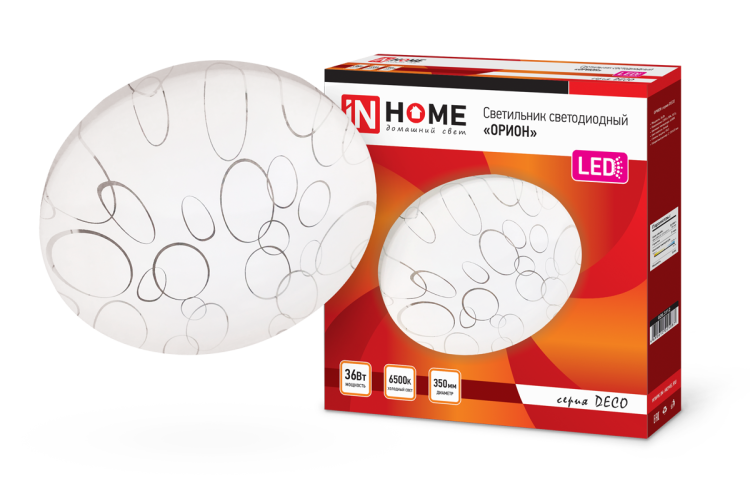 Светильник светодиодный 36 Вт 230 В 6500 К 2340 лм 350х55 мм серии DECO от IN HOME - компактный настенный источник света с высокой яркостью и нейтрально-белым цветом, подходящий для жилых и общественных помещений. Артикул 4690612025087 соответствует модели из линейки ОРИОН, которая сочетает функциональность и минималистичный дизайн.