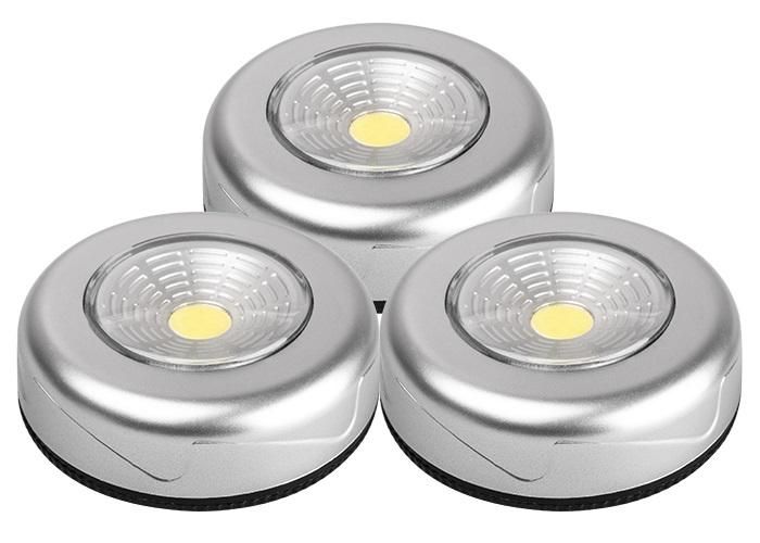 Светильник светодиодный пушлайт TF3-3xL1W-sr 1Вт COB 7500К IP20 50лм 3хAAA серебристый используется там, где нужна точечная подсветка, а установка проводки затруднена. Он активируется простым нажатием - никаких выключателей или переключателей. Подходит для освещения внутренних помещений: шкафов, тумбочек, рабочих зон, чердаков, гаражей, кладовых. Также применяется в качестве сигнализирующего или ориентировочного а в условиях ограниченного доступа к электроэнергии.