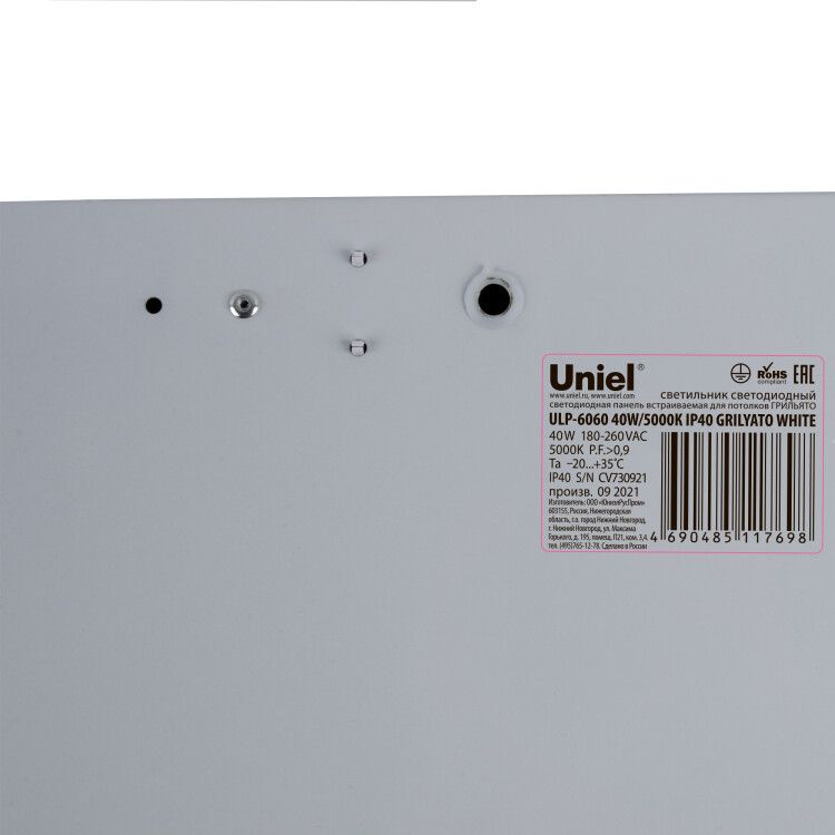 Светильник светодиодный потолочный встраиваемый 40Вт 5000К 4600Лм от Uniel (артикулы ulp-6060 40w/5000к ip40 grilyato white и ul-00005199) предназначен для равномерного и энергоэффективного освещения помещений с потолками из гипсокартона, натяжных или бетонных конструкций. Встроенный источник питания и призматический рассеиватель обеспечивают стабильную работу без мерцания.