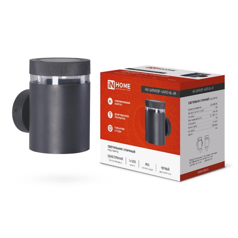 Светильник уличный настенный односторонний ЦИЛИНДР-1хGX53-BL-AR IP65 алюминиевый под лампу 1хGX53 черный от бренда IN HOME предназначен для равномерной подсветки фасадов зданий. Его компактный дизайн, прочный алюминиевый корпус и степень защиты IP65 делают его надёжным решением для улицы, террас и входных групп.