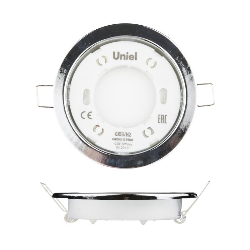 Светильник встраиваемый точечный ультратонкий GX53/H2 Chrome 10 PROM с корпусом из хромированного металла - компактное решение для встроенной подсветки потолков в жилых и коммерческих помещениях. Упаковка содержит 10 единиц, что удобно для масштабной установки. Бренд Uniel обеспечивает надёжную сборку и соответствие заявленным параметрам.