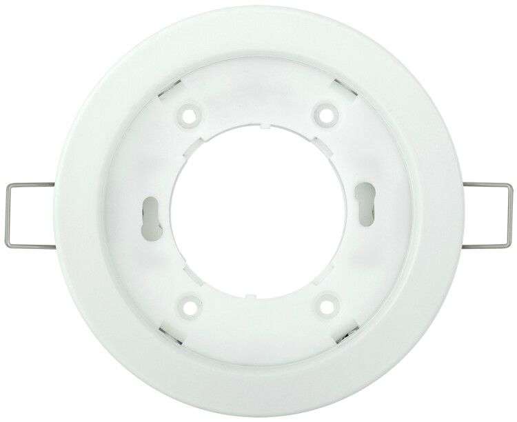 Светильник точечный встраиваемый под лампу GX53 белый совместим со всеми LED-лампами стандарта GX53 мощностью до 15 Вт. Установка выполняется в подготовленное отверстие диаметром 95–100 мм. Комплектация включает монтажную скобу и защитное кольцо для безопасной фixации в натяжных потолках - предотвращает деформацию материала при закручивании. Монтаж не требует специального инструмента: достаточно вставить светильник в отверстие и зафиксировать скобой с помощью обычной отвёртки. Патрон изготовлен из термостойкого негорючего пластика - безопасен при длительной работе.