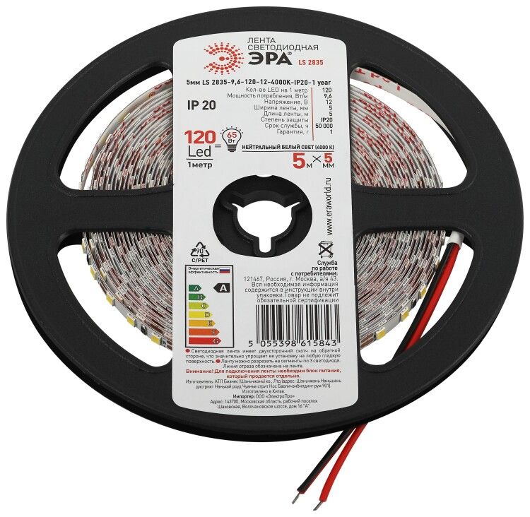 - Светодиодная лента узкая 5мм LS2835 9.6-120-12-4000K-IP20 5м нейтральный белый свет от ЭРА имеет гарантию 1 год - сохраняйте чек и упаковку