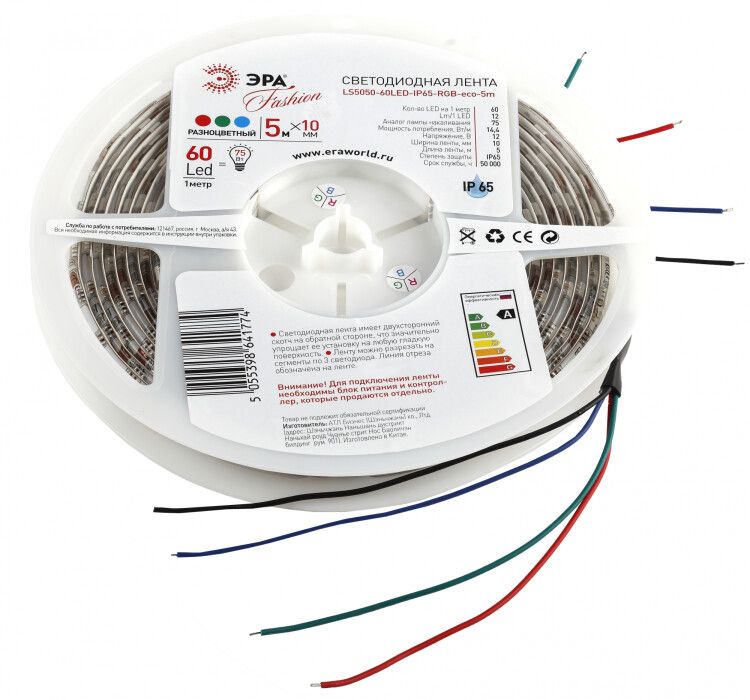 Лента светодиодная LS5050-14,4-60-12-RGB-IP65-1 year-5m - это самоклеящаяся RGB-лента с высокой плотностью светодиодов и защитой IP65, подходящая для интерьерного и уличного освещения. Бренд ЭРА предлагает эту модель как надежное решение для декоративной и функциональной подсветки, где важны яркость, гибкость и долговечность.