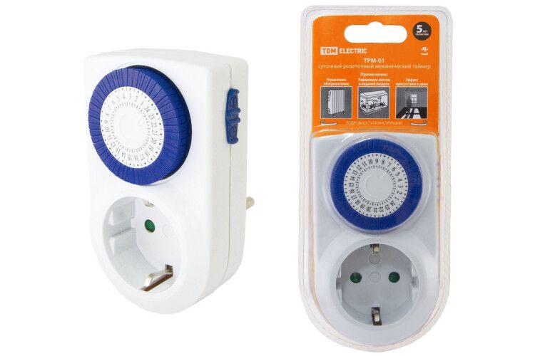 Таймер розеточный механический ТРМ-01-30мин/24ч-16А (суточный) - SQ1506-0001 TDM ELECTRIC предназначен для автоматизации управления бытовыми электроприборами и освещением. Он оснащен синхронным часовым механизмом и имеет часовую-суточную программу.