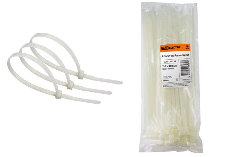 Хомут нейлоновый 7,6х300мм (белый) (100шт) от TDM ELECTRIC - это надёжный крепёж для организации проводки в бытовых и промышленных системах. Подходит для фиксации кабелей внутри помещений и на улице, выдерживает широкий температурный диапазон и устойчив к воздействию солнечного света.
