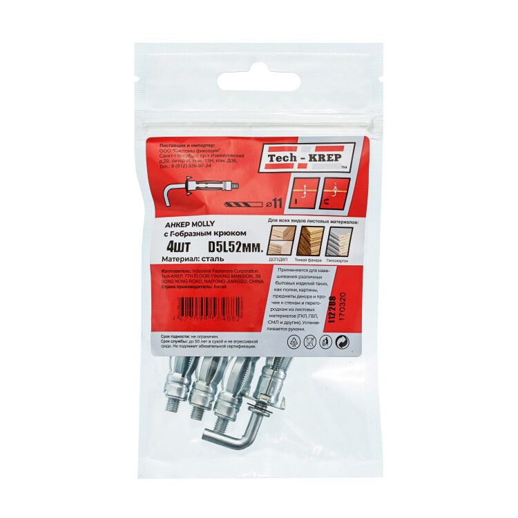 | Анкер-дюбель Молли W М5х52 с крюком (4шт) - 112288 | 07.03.2026 | Под заказ | 169,79 ₽ | уп. | от 30 дней |