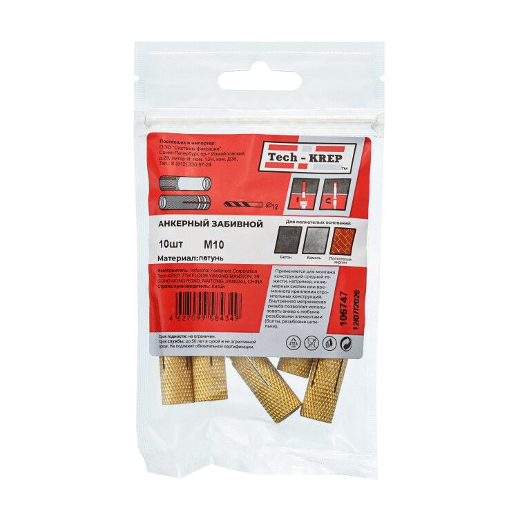 Анкер забиваемый латунный М10 (10 шт) - пакет (0,139 кг) | 106747 Tech-KREP - надежный и удобный выбор для различных видов монтажа и крепления.