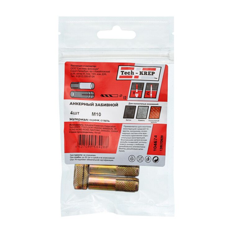 | Анкер забиваемый оцинкованный М10 (4 шт) - пакет ( 0,099 кг) | 104674 | Tech-KREP | 13.03.2026 | Под заказ | 53,51 ₽ | уп. | от 30 дней |