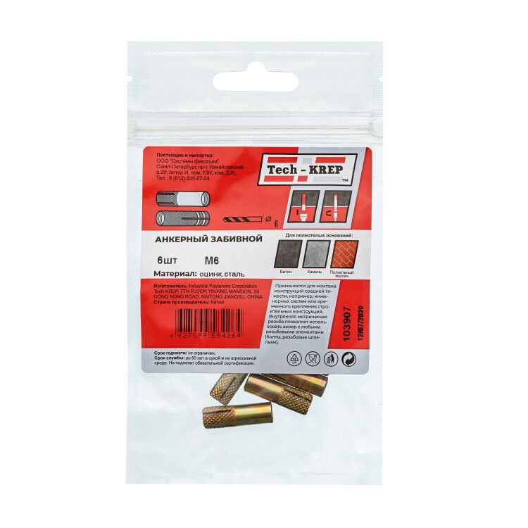 | Анкер забиваемый оцинкованный М6 (6 шт) - пакет ( 0,041 кг) | 103907 | Tech-KREP | 13.03.2026 | Под заказ | 46,64 ₽ | уп. | от 30 дней |