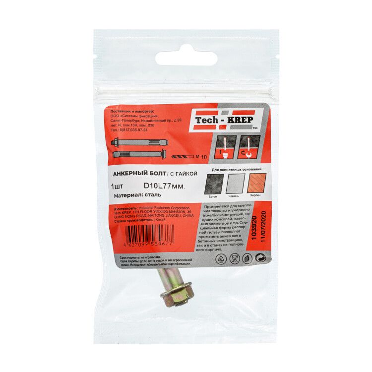 | Анкерный болт с гайкой 10х77 (1 шт) - пакет ( 0,044 кг) | 103920 | Tech-KREP | 20.02.2026 | 80 уп. | 31,56 ₽ | уп. | от 30 дней |