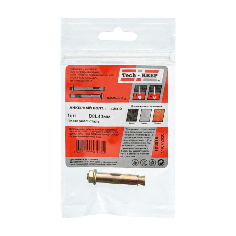 | Болт анкерный 8х40 с гайкой (1шт) - 103916 | 14.03.2026 | Под заказ | 17,66 ₽ | уп. | от 30 дней |