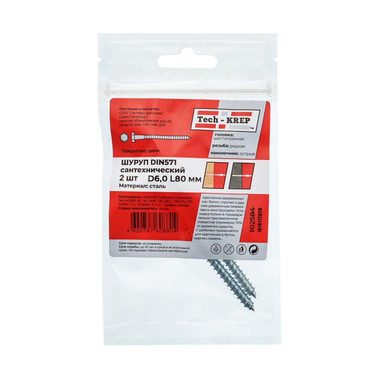Шуруп DIN571 6х80 сантехнический, шестигранная головка (2шт) - пакет 102584 Tech-KREP является надежным и универсальным крепежом, который подходит для широкого спектра задач и обеспечивает прочное и долговечное соединение.