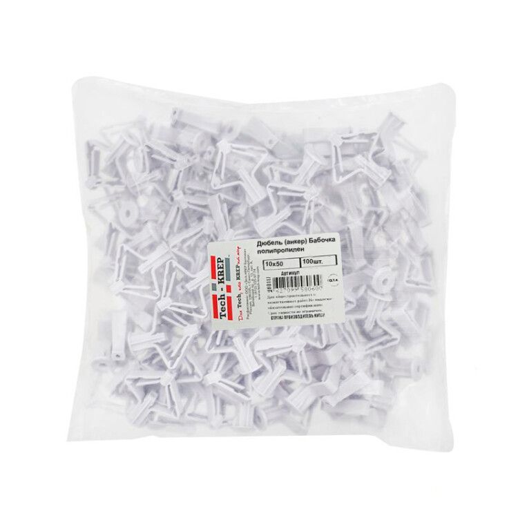 Дюбель (анкер) бабочка полипропилен 10х50 (100 шт) – пакет от Tech-KREP предназначен для крепления легких конструкций к тонкостенным материалам, таким как гипсокартон, ДСП и фанера. Этот тип дюбеля особенно эффективен там, где обычные анкеры не работают из-за хрупкости основания.