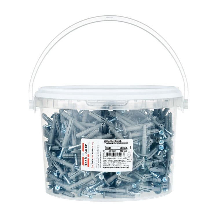 Дюбель-гвоздь 6х40 гриб. манжета (полипропилен) (500 шт) - ведро ( 1,888 кг) | 113143 Tech-KREP
