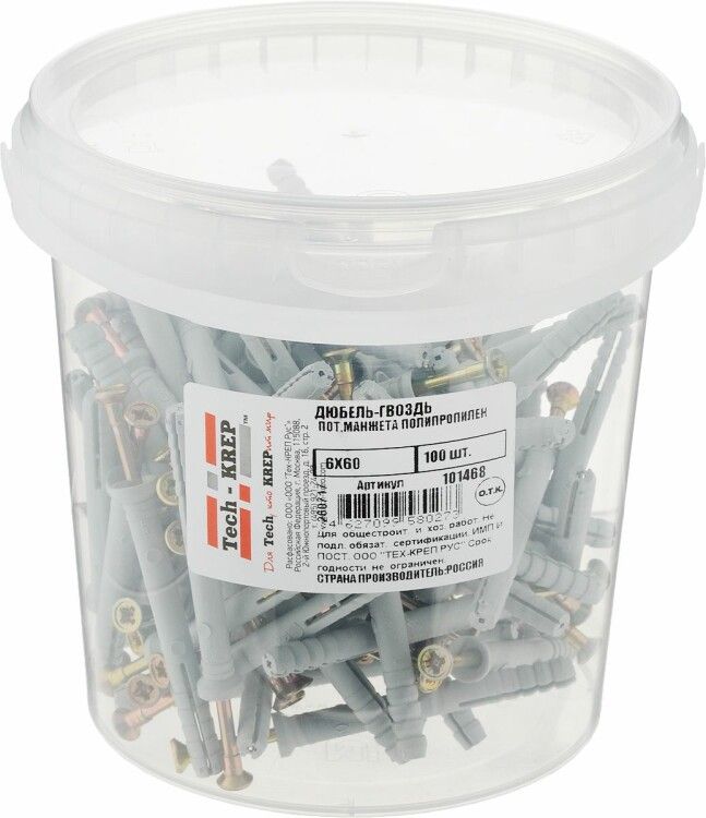 Дюбель-гвоздь 6х60 пот. манжета (полипропилен) (100 шт) - ведро ( 0,53 кг) | 101468 Tech-KREP