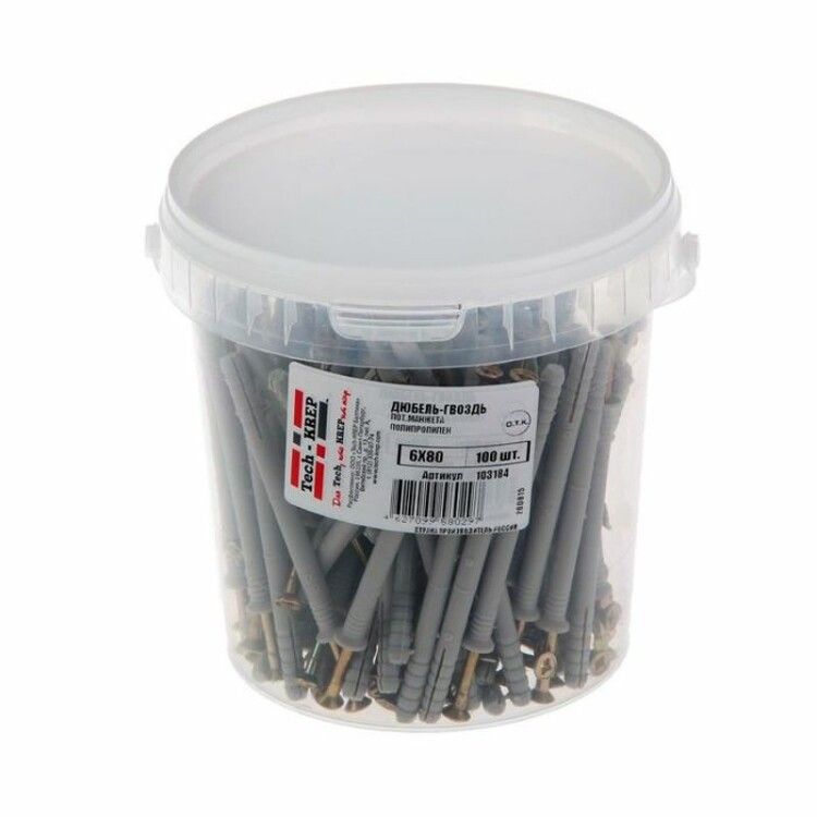 Дюбель-гвоздь 6х80 пот. манжета (полипропилен) (100 шт) - ведро ( 0,708 кг) | 103184 Tech-KREP