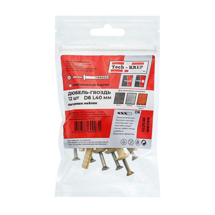 Дюбель-гвоздь 6L40 гриб. манжета (нейлон) (12 шт) - пакет ( 0,048 кг) | 102938 Tech-KREP