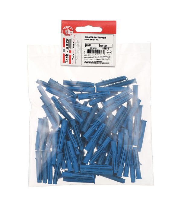 - Дюбель распорный 6х40 шипы+усы (полипропилен) (100 шт) - пакет от Tech-KREP идеально сочетается с аналогичными крепежами этой же серии - удобно комплектовать целые системы.