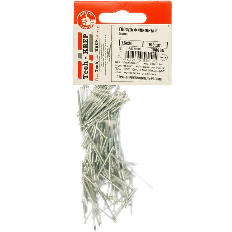 Гвоздь финишный оцинк. 1,6х30 (190 шт) - пакет ( 0,099 кг) | 108066 Tech-KREP