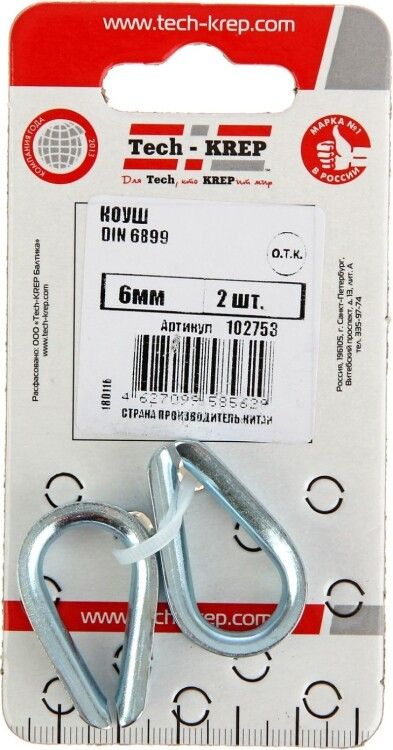 Коуш DIN6899 М6 (2 шт) от Tech-KREP - металлический элемент для формирования надёжных петель на тросах, защищающий их от перегибов и истирания. Подходит для строительных, монтажных и такелажных задач, особенно где важна долговечность соединений. Артикул 102753 включает два комплекта.