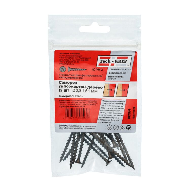 Саморез гипсокартон-дерево 3.8х51 (пакет) (уп.18шт) Tech-Krep/Zitar 102374