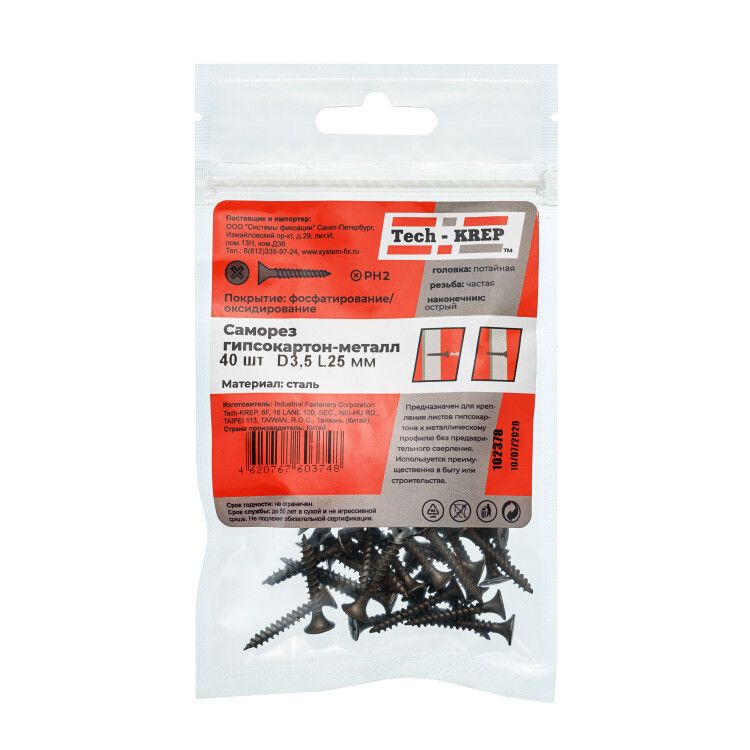 Саморез гипсокартон-металл 3.5х25 (пакет) (уп.40шт) Tech-Krep/Zitar 102378