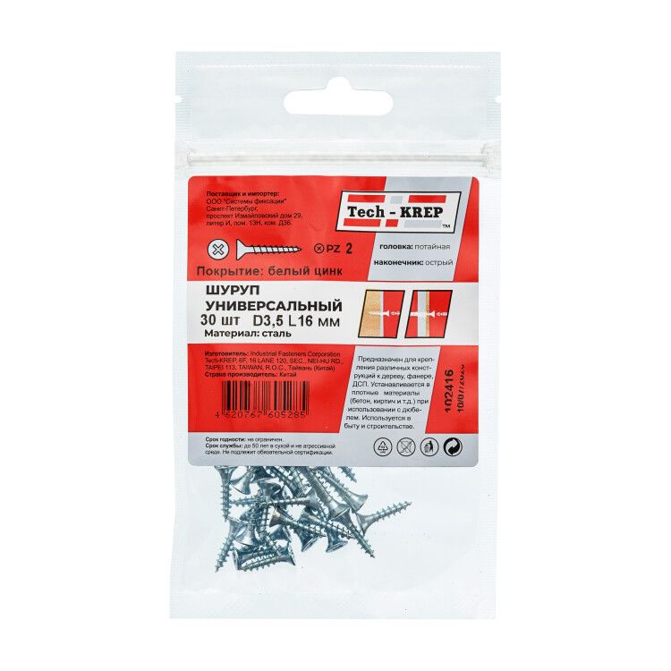 | Шуруп универсальный 3.5х16 с потайной головкой цинк. (пакет) (уп.30шт) Tech-Krep/Zitar 102416 | 23.02.2026 | 11100 шт. | 0,62 ₽ | шт. | от 9 дней |