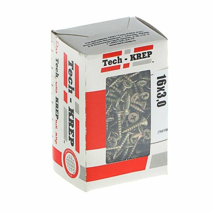 Саморезы Tech-KREP 16х3,0 мм вставляются прямо в материал без подготовки отверстия - при условии, что основание не слишком твёрдое. Для ДСП, фанеры и мягкого дерева достаточно обычной отвёртки или шуруповёрта на малых оборотах. При работе с твёрдыми поверхностями (бетон, кирпич, металл толще 2 мм) требуется предварительно просверлить отверстие и использовать подходящий дюбель. Шлиц PZ1 требует точного совпадения с битой - использование неподходящих насадок повредит головку.