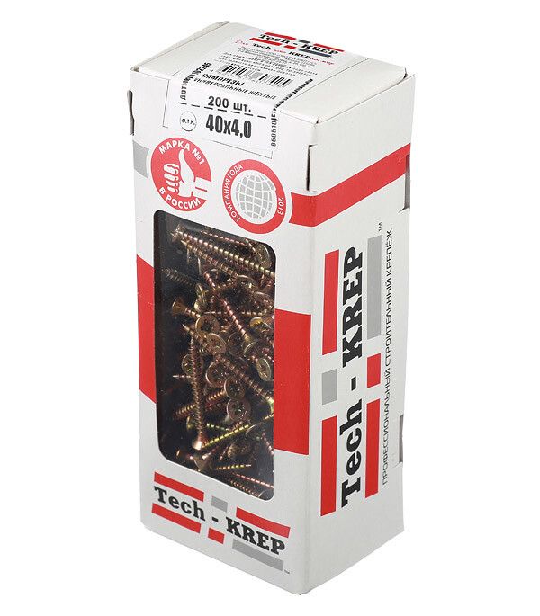 Саморез универсальный Tech-KREP 4x40 мм с потайной головкой и остроконечным концом предназначен для надежного крепления в металле, дереве, пластике и листовых материалах. Упаковка содержит 200 штук - оптимальный объем для ремонта, производства мебели и строительных работ. Желтопассивированное покрытие обеспечивает антикоррозийную защиту, а совместимость с шуруповертами PZ2 ускоряет монтаж.
