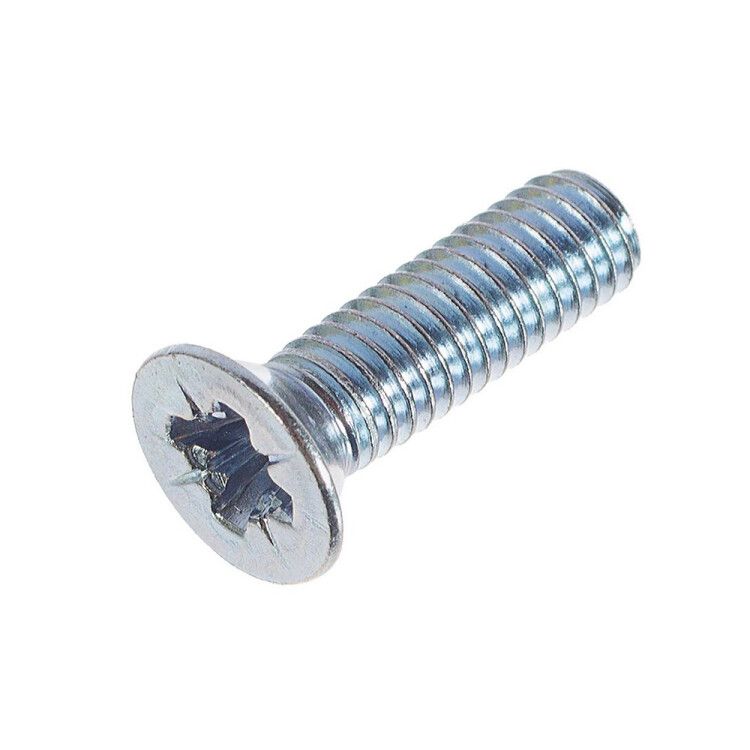 Винт DIN965 с потайной головкой оцинкованный М6х20 (100 шт) требует предварительного сверления отверстия диаметром 5–5,2 мм и последующего нарезания внутренней резьбы М6. Головка должна входить в зенкованное углубление под углом 90° - так она будет заподлицо с поверхностью. Совместим с обычными шайбами и гайками М6, хотя чаще используется без них - как самонарезающий элемент в подготовленное отверстие. Для монтажа нужна отвёртка с битой PH1 или PH2.