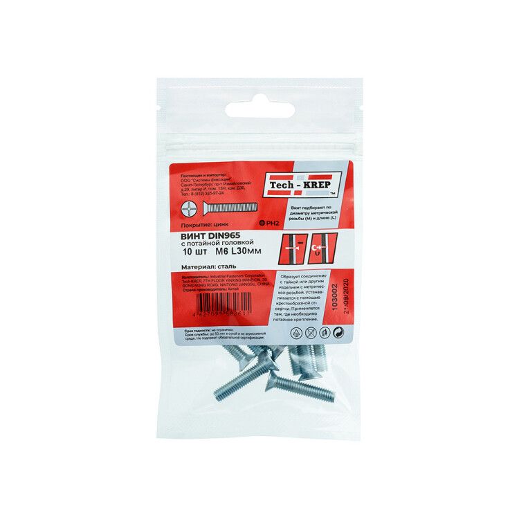 Винт DIN965 с потайной головкой оцинк. М6х30 (10 шт) - пакет ( 0,066 кг) | 103002 Tech-KREP